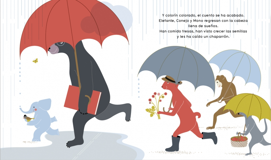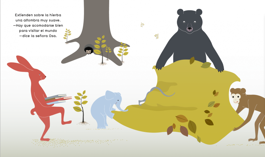 Mono, Elefante, Ratón y Conejo están muy impacientes esperando a alguien. Por fin, llega la señora Osa cargada de libros con cuentos para contarles y así transportarlos muy lejos, a sitios insospechados, asombrosos, divertidos…