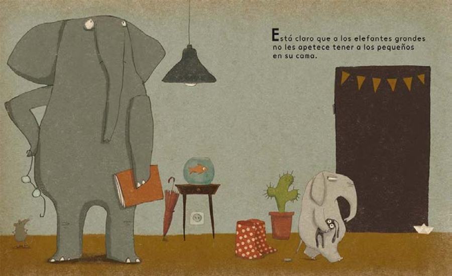 Al pequeño elefante se le ha metido una idea en la cabeza: quiere dormir en la cama de Elefante Grande. Y aunque Elefante Grande le ha dicho que no, él no parará hasta conseguirlo. El pequeño elefante pone en marcha un plan: espera a que Elefante Grande se duerma y, de puntillas, se mete en su cama. Pero Elefante Grande ronca, es pesado y ocupa todo el espacio. El elefantito no pega ojo en toda la noche y vuelve a su cuarto…, ¡cuando ya amanece y Elefante Grande viene a despertarlo! A todos los niños pequeños les gusta ir a la cama de sus padres. La oscuridad, la noche, la soledad… Todo esto les produce angustia. En cambio, estar acurrucados junto a sus padres les reconforta y consuela. Pero, aunque excepcionalmente los padres les dejen colarse bajo la manta, lo aconsejable es que cada uno duerma en su propia cama. Kris di Giacomo, ilustrador de «La vocecita» y «La tarta de hadas», se luce nuevamente junto a Coralie Saudo («Mi papá» y «Mi papá en el zoo»). En esta ocasión ambos ofrecen a los padres un buen recurso para la hora de dormir. Los padres accederán a la recurrente demanda infantil, pero solo por un rato; para compartir este divertido libro, reírse con las ilustraciones y disfrutar con una historia redonda, compuesta por frases breves y chispeantes. Los niños se convencerán de que dormir todos juntos no es tan buena idea. El mejor plan será esperar en su camita y preparar la sonrisa para recibir a los padres que vendrán a darles los buenos días.