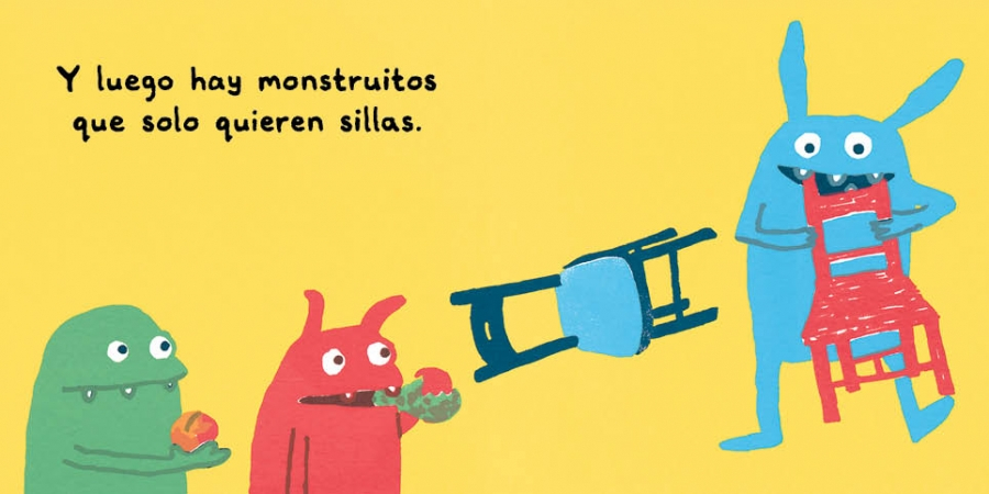 Todos los monstruitos tienen hambre. Solo que algunos monstruitos comen melocotones, albóndigas o tarta. Sin embargo, otros prefieren las sillas, los zapatos o los tractores. ¿Qué será lo más sabroso?