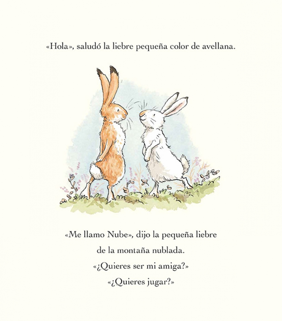 La pequeña liebre color de avellana reanudó su paseo y, muy pronto, llegó al pie de la montaña nublada. ¡Vaya sorpresa la esperaba allí, entre los brezos!