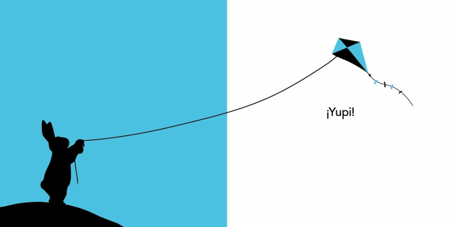 Con apenas unas siluetas en negro sobre páginas blancas, bloques de color amarillos, azules o magentas y unas breves onomatopeyas, esta artista polifacética logra imbuir a este entrañable conejito de personalidad e incluso humor.