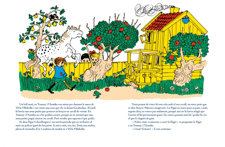 Aquest volum, en format àlbum, pretén introduir, recrear i apropar, als més petits, l’extraordinari personatge de la Pippi Calcesllargues, la nena més forta del món.