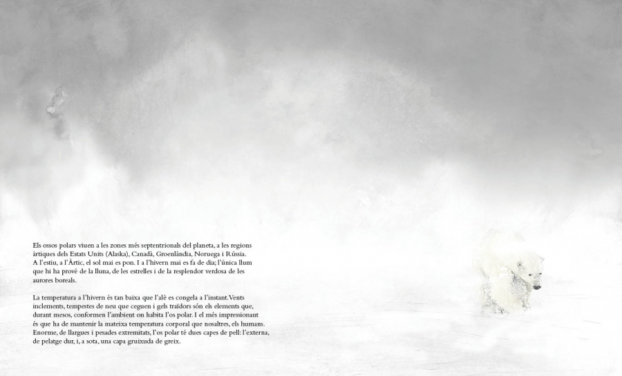 Es va assabentar que les urpes de l’os blanc, que viu entre la neu de l’Àrtic, poden mesurar tant com un plat dels que fem servir per menjar. Va llegir que quan l’os es mulla s’espolsa l’aigua igual que els gossos i que gruny, rugeix, miola i fins ronca. La nena es va sorprendre quan va aprendre que aquest mamífer fa de cap a peus el mateix que dos nens de set anys, l’un a sobre de l’altre.
