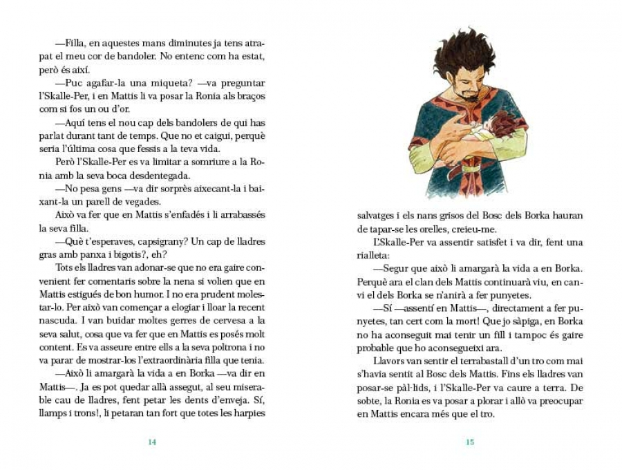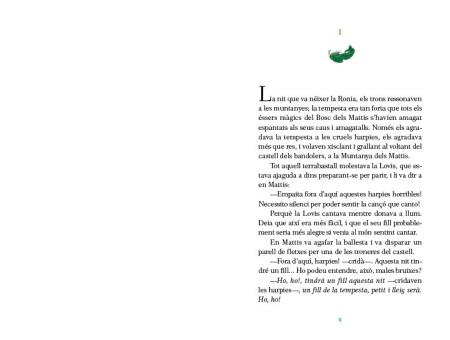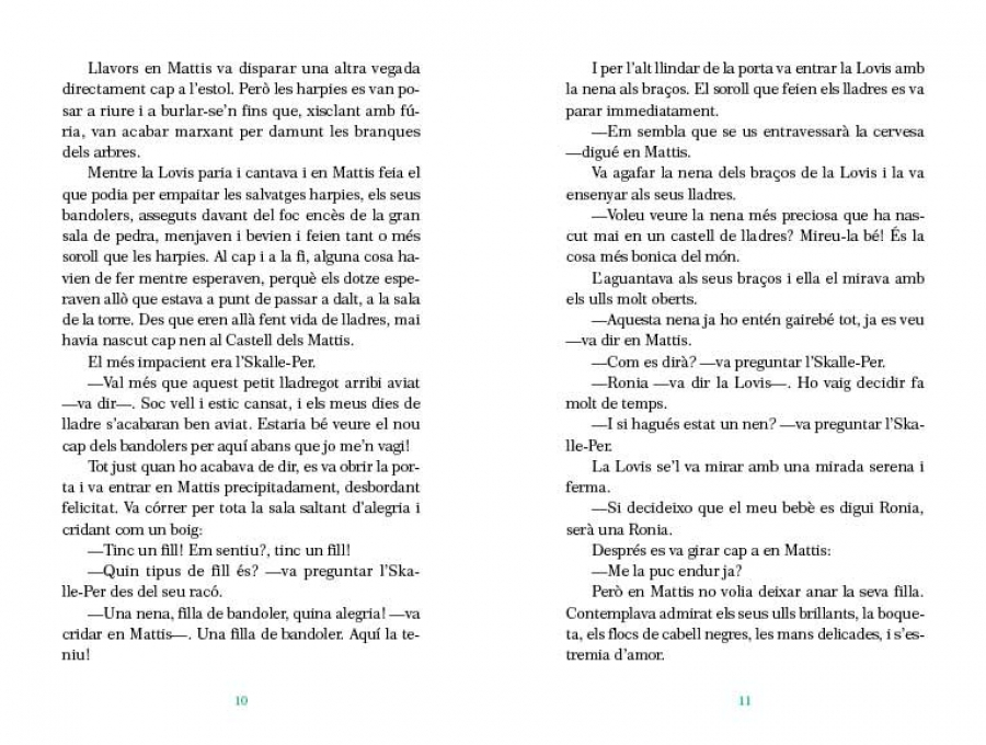 La nit que va néixer la Ronia, els trons ressonaven a les muntanyes i un llamp va partir per la meitat el castell dels lladres. Així comença la història de Ronia, enmig una nit tan extraordinària com ho serà la seva vida.