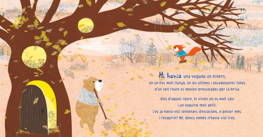 Un os molt savi i un esquirol molt petit viuen junts dins un vell roure. L’esquirol mai no ha vist la neu i l’espera amb il·lusió. Però quan per fi arriba, el seu estimat os està refredat i no pot sortir a jugar. Llavors a l’esquirol se li acut una idea genial...