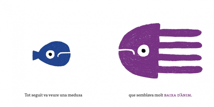 El peixet no entenia què passava en aquell mar de llàgrimes; per què les meduses, les sardines, el calamar i tota la resta de peixos que es creuaven en el seu camí estaven igual de deprimits? La tortuga, que, curiosament, estava de cap per amunt, li va explicar que ningú no estava trist. És que el peixet estava de l’inrevés!