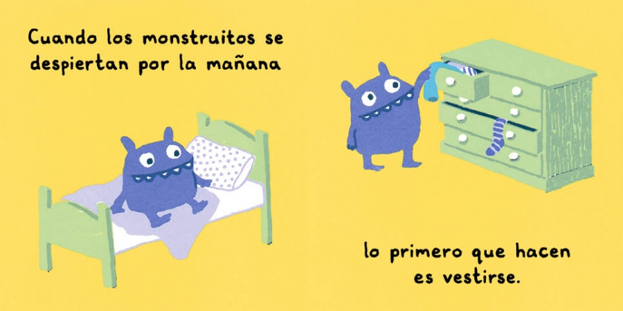 Al igual que hacen los niños, los monstruitos se visten todas las mañanas. Uno se pone un sombrero y otro un tomate. Uno usa calcetines y otro usa cochecitos. Alguno se queda en pijama y… ¡Eh! ¿Qué se ha puesto el último?