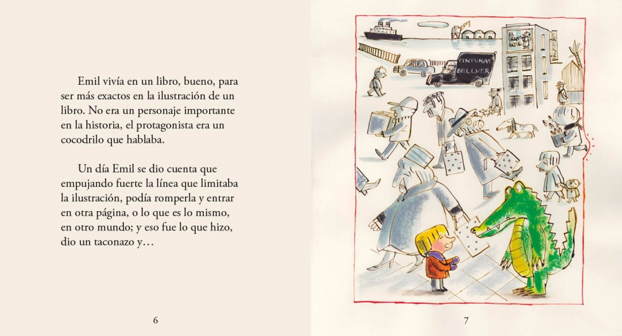 Emil vivía en un libro, bueno, para ser más exactos en la ilustración de un libro. No era un personaje importante en la historia, el protagonista era un cocodrilo que hablaba. Un día Emil se dio cuenta que empujando fuerte la línea que limitaba la ilustración, podía romperla y entrar en otra página, o lo que es lo mismo, en otro mundo; y eso fue lo que hizo, dio un taconazo y....