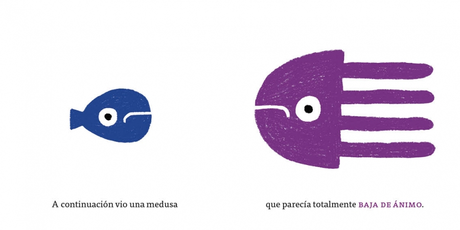El pececito no entendía qué pasaba en ese mar de lágrimas; por qué las medusas, las sardinas, el calamar y todos los diferentes peces que se cruzaban en su camino estaban igual de deprimidos. La tortuga que, curiosamente, estaba boca arriba le explicó que nadie estaba triste. ¡Es que el pececito estaba del revés!