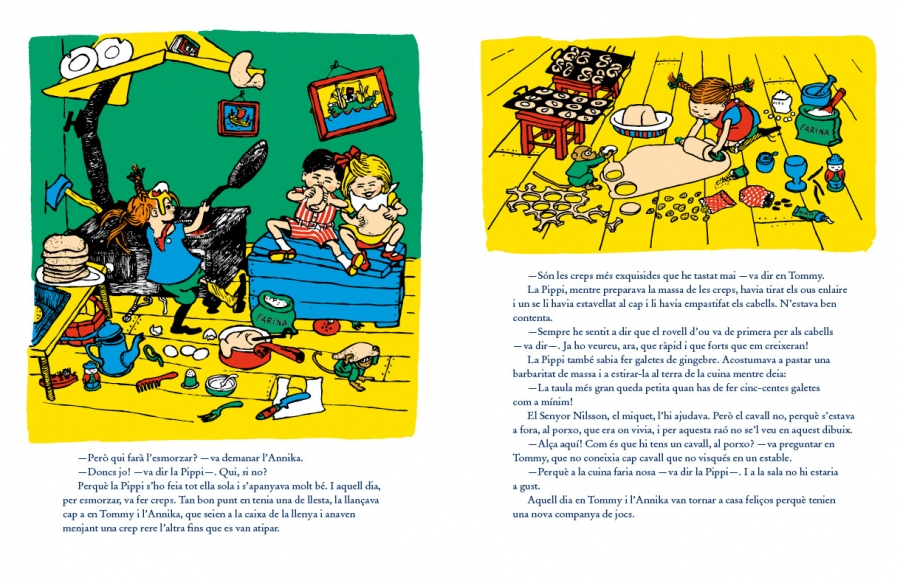 Aquest volum, en format àlbum, pretén introduir, recrear i apropar, als més petits, l’extraordinari personatge de la Pippi Calcesllargues, la nena més forta del món.