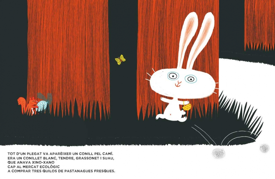 El primer conill descobreix que el llop parla rar perquè té un pèl a la llengua. Li promet l’hi traurà i, amb aquest ardit, s’escapa. Un altre conill l’enganya «ensenyant-lo» a caçar bé. El llop finalment s’equivoca, ataca un os i en la fugida es clava una patacada i perd les dents. I es fa vegetarià!