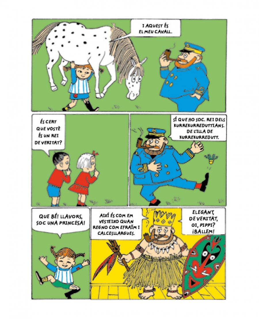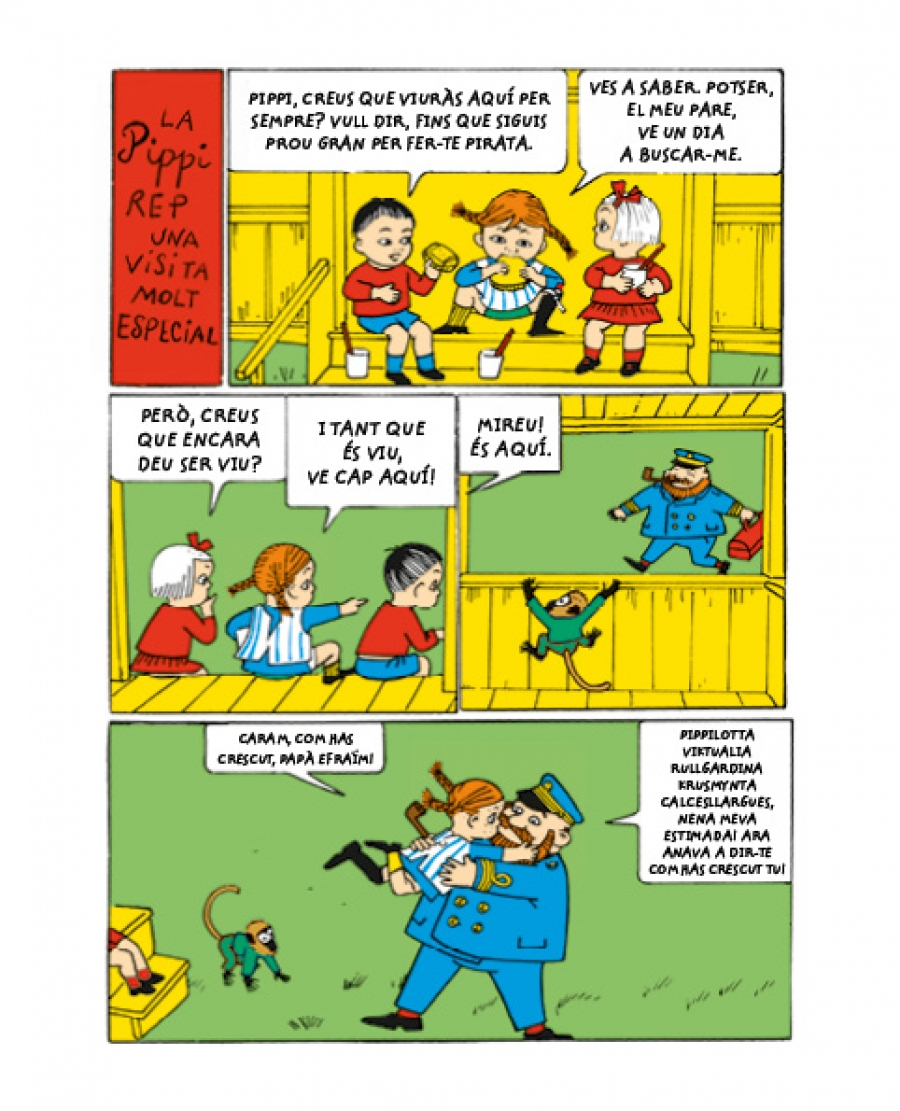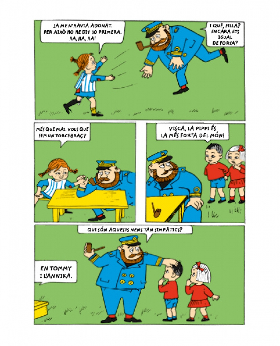 Aquest volum, en format còmic, és el quart d’una col·lecció que pretén acostar als primers lectors l’extraordinari personatge de la Pippi, la nena més forta del món.