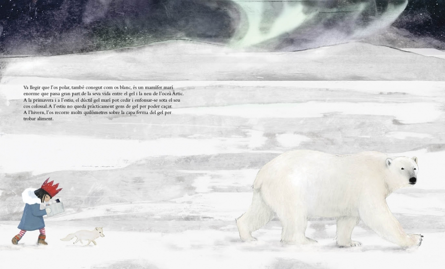 Es va assabentar que les urpes de l’os blanc, que viu entre la neu de l’Àrtic, poden mesurar tant com un plat dels que fem servir per menjar. Va llegir que quan l’os es mulla s’espolsa l’aigua igual que els gossos i que gruny, rugeix, miola i fins ronca. La nena es va sorprendre quan va aprendre que aquest mamífer fa de cap a peus el mateix que dos nens de set anys, l’un a sobre de l’altre.