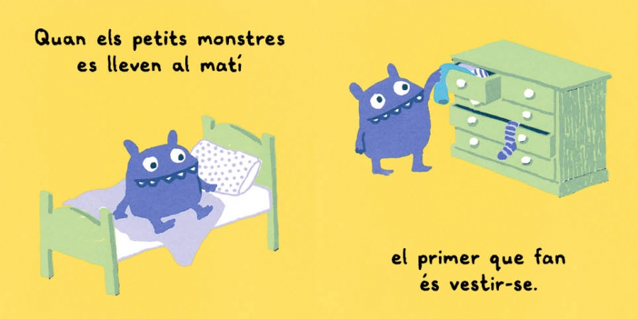 Igual que els nens, els monstres es vesteixen cada matí. Un es posa un barret i un altre un tomàquet. Un porta mitjons i un altre, cotxes. N’hi ha uns que es queden en pijama i… Eh! Què s’ha posat el darrer?