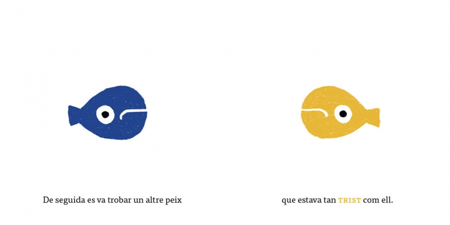 El peixet no entenia què passava en aquell mar de llàgrimes; per què les meduses, les sardines, el calamar i tota la resta de peixos que es creuaven en el seu camí estaven igual de deprimits? La tortuga, que, curiosament, estava de cap per amunt, li va explicar que ningú no estava trist. És que el peixet estava de l’inrevés!