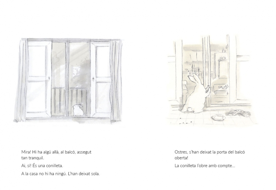Els amos d’una conilleta se’n van a passar un dia fora i la deixen al balcó. Ella entra sigil·losament dins la casa i... Comença l’aventura! S’asseu a la taula a menjar a taula, mira un pel·lícula de dibuixos animats, es maquilla davant del mirall, es disfressa amb un vestit molt bonic... fins que al final s’adorm. L’endemà al matí, torna al balcó, però deixa algunes pistes de la seva aventura!
