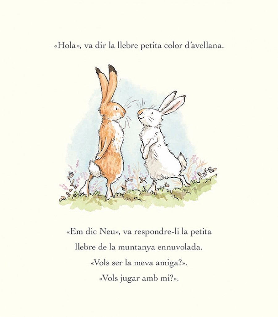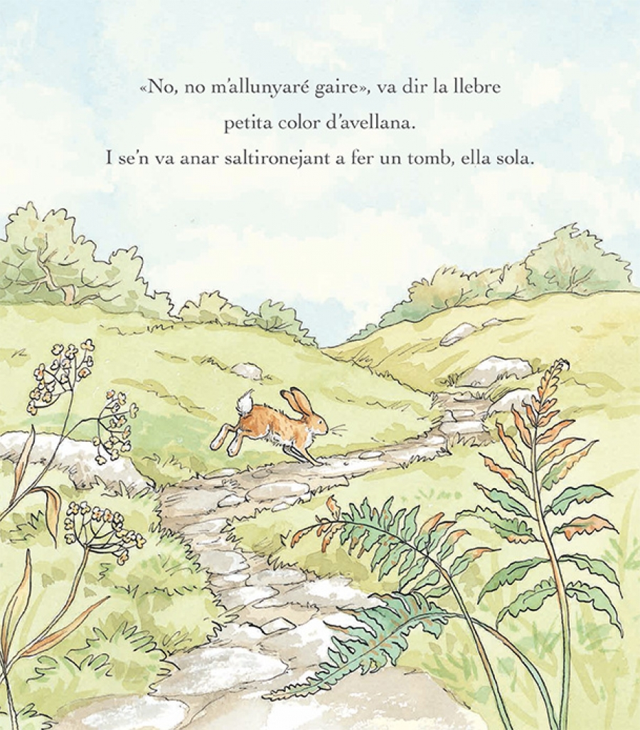 La llebre petita color d’avellana va continuar el seu tomb i va arribar al peu de la muntanya ennuvolada. Quina sorpresa l’esperava allà, entremig dels matolls!